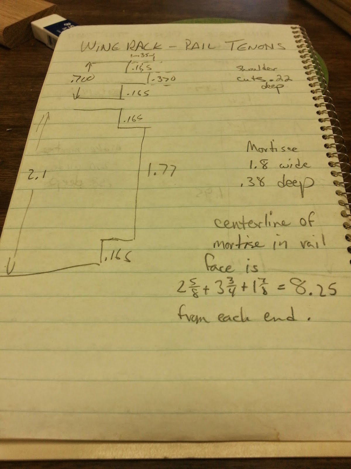 I milled 20 stretchers, plus enough extra for some test pieces, and then started creating the tenons. First, I had to establish the exact dimensions of the tenon. No need to try to decipher the figure below; it's just there so I can refer to it later. If you are really curious, double-click it to get the full-sized version.