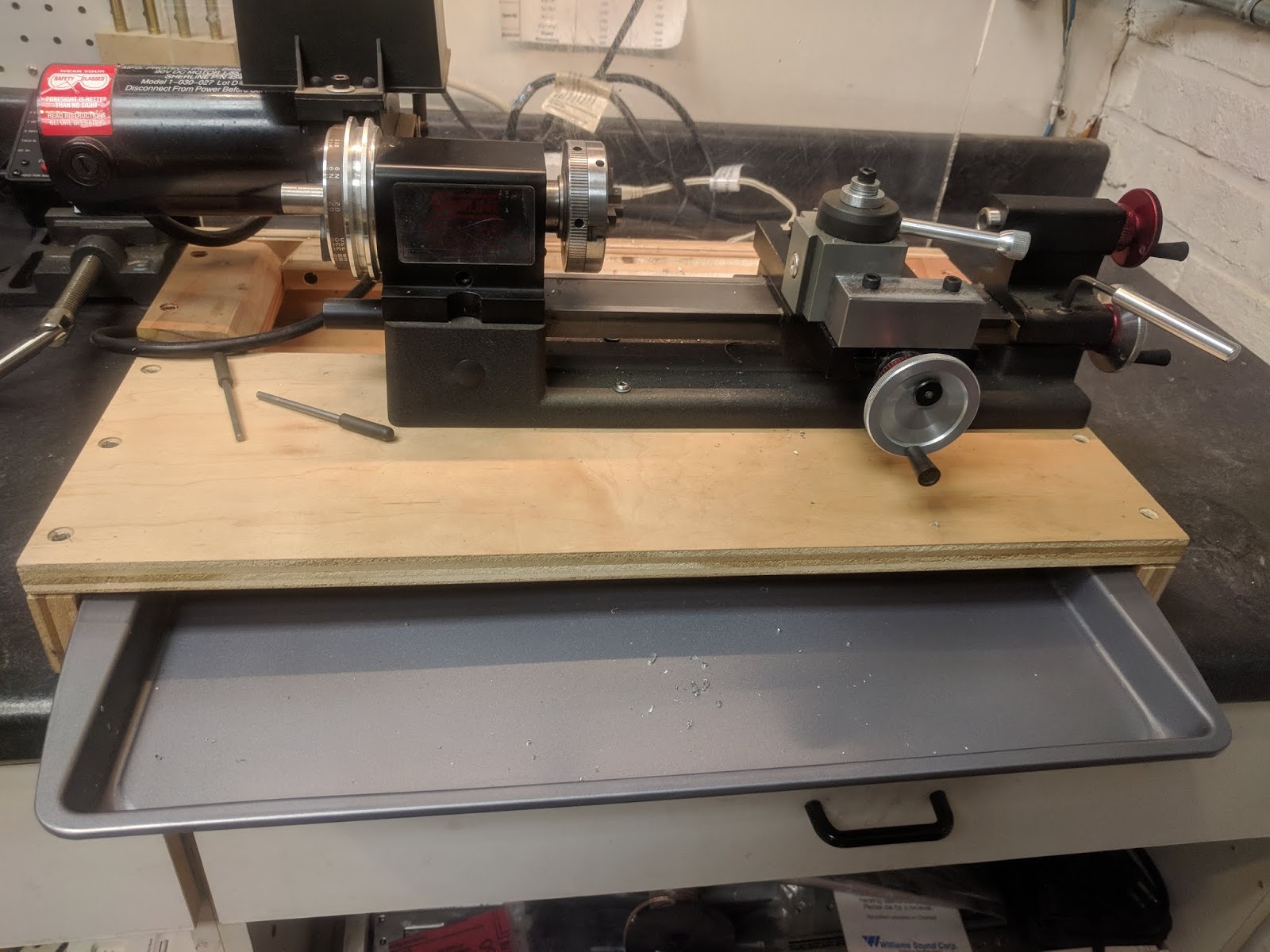 I added the base. It's sized around a standard 12" X 18" cookie sheet, which catches the metal "swarf" and slides out for easy cleanup. That's a clear plexiglass panel behind it, and out of the frame is a built-in LED work light.
