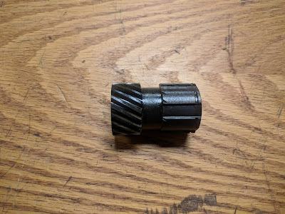 The other friction material mates with a steel brake cone, and its purpose comes clear if you scroll up and look at the picture of the sun gear again. See the splines on the end opposite the gear? They mate with the splines in the center of the cone clutch. When the cone clutch is pulled back from the annulus against the brake cone, it stops cold, and stops the sun gear with it. The main shaft is still free to spin inside the sun gear, but now the overdrive is engaged.
